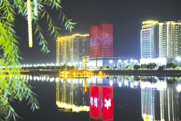 10月20日,淮阳龙湖旁楼体上的霓虹灯打出“庆祝二十大”字样。近日,每当夜幕降临,华灯初上,淮阳龙湖旁上演绚丽灯光秀,“永远跟党走”“建功新时代”等字样的五彩霓虹闪烁,一路绵延不绝,犹如流动的华彩乐章,市民纷纷用手机定格下这美丽的瞬间。记者 刘俊涛 摄