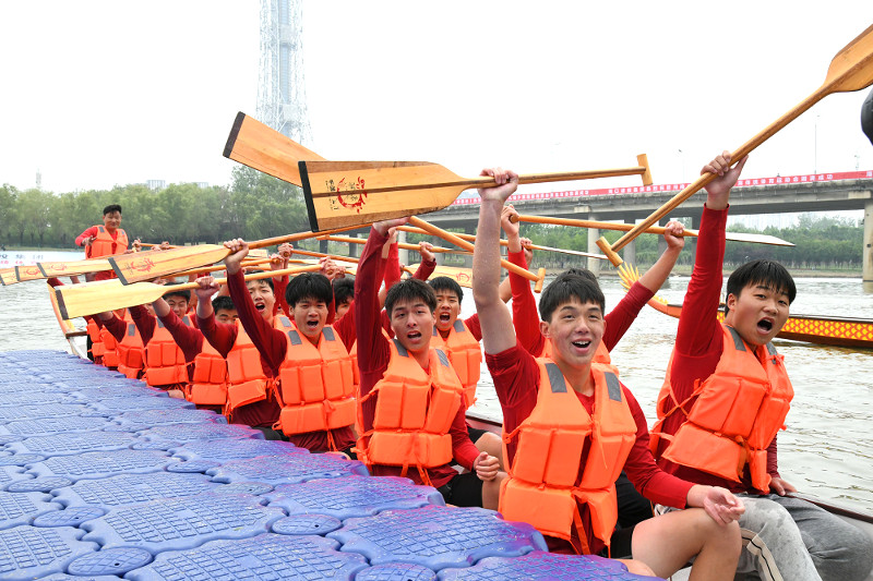 4月24日上午,河南省第九届少数民族传统体育运动会龙舟赛在位于沙颍河上的周口市水上运动训练中心开赛,来自省内9支代表队参与角逐。图为选手们举桨呐喊出征。记者 梁照曾 摄