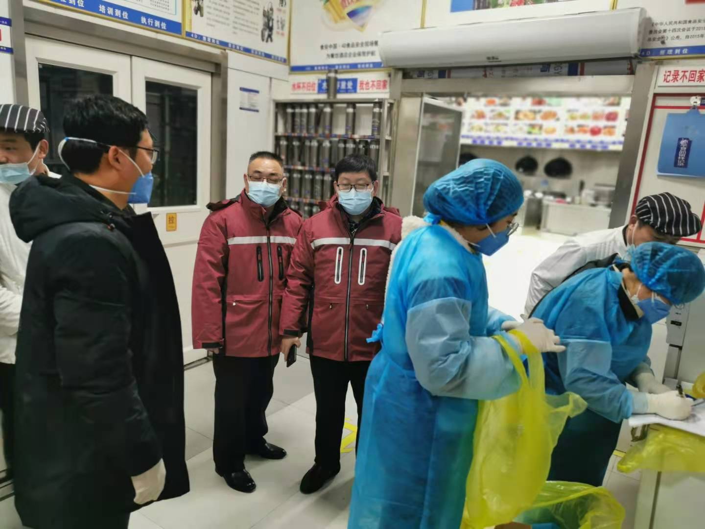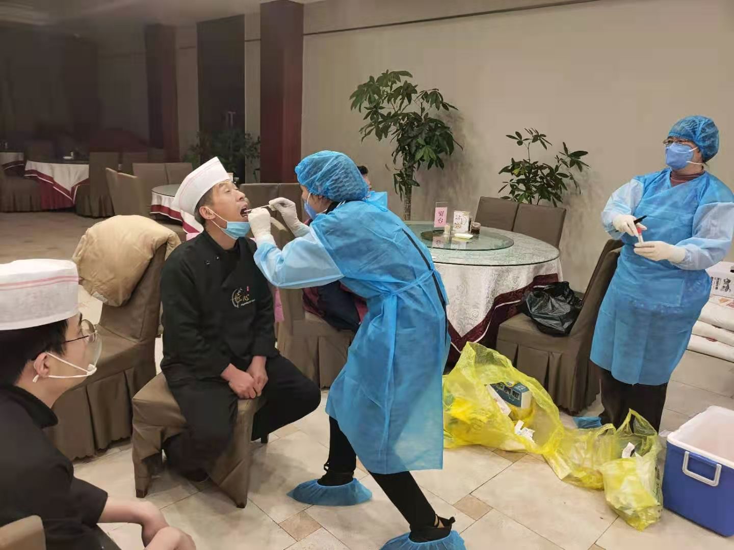 为助力第一届周商大会圆满成功,市卫生健康委抽调近百名调精兵强将组成卫生保障专班开展卫勤保障工作。图为工作人员在市委党校迎宾馆和体育宾馆餐厅对后厨人员做核酸检测及开展冷链食品消毒。