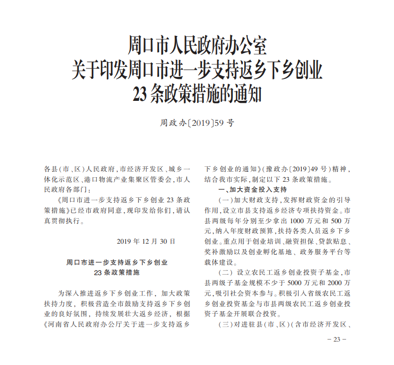 周口市人民政府办公室关于印发周口市进一步支持返乡下乡创业 23 条政策措施的通知