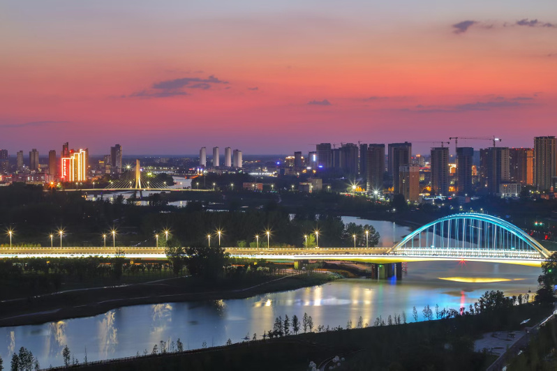 入夜,河水静静流过中心城区,城区如一幅唯美的画卷。(王建辉 摄)